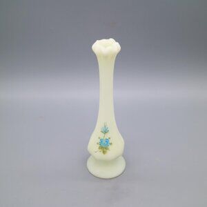 Fenton Yellow Satin Custard Glass Hand Painted Bud Vase Blue Satin Roses Signed