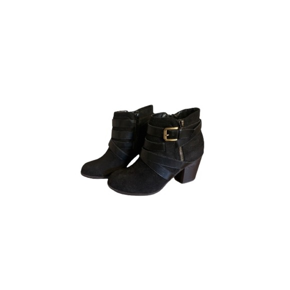 New, unworn Fergalicious by Fergie black block heeled booties with buckles and side zippers in women’s size seven (7).