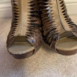 The heel is about 4.5 inches, but because it is a thicker stiletto...it makes it very comfortable and easy to walk in.
