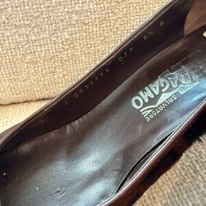 Leopard animal print pumps, brown, heels, slide on, bow detail, rounded toe, slip on heels pump shoes made by Salvatore Ferragamo. In great previously owned condition. Please see pictures for details and measurements.