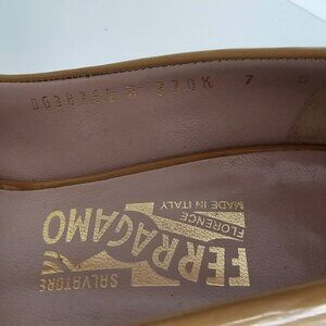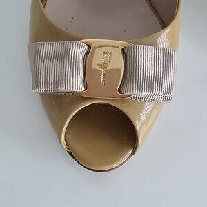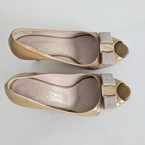 Ferragamo Beige Patent Leather Ribes Vara Bow Peep Toe Pumps Size 7