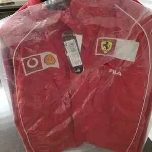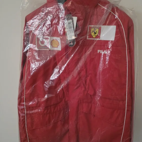 Red Ferrari racing jacket with logo patches. Stylish and bold design.