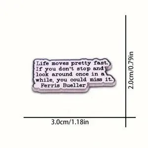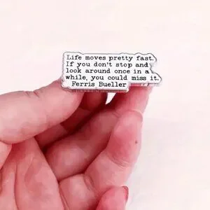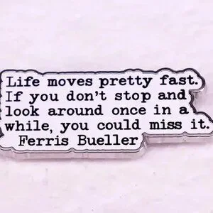 The Ferris Bueller Pin features the iconic quote "life moves pretty fast" . Perfect for fans of the classic movie. Add to your collection today!