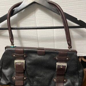 Size 14” X 7” X 4.5”. 22.5” handle that comfortably fits shoulder. Colors black and chocolate brown. Material: outer genuine pebbled leather, inside lined with vinyl fabric. Top snap button closure. Outer zip pocket and inner zip pocket. Inner pouch. 2 decorative belt buckle flaps and handle in chocolate brown. The rest of the bag is black. Rare find. NWT.