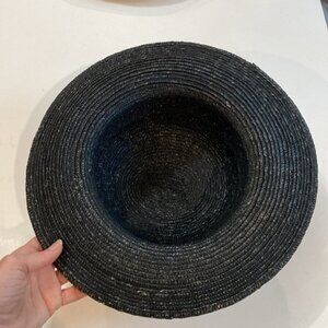 This is a black straw hat with a wide brim and a tall, rounded crown. The hat is made of a woven straw material and has a slightly rough texture. The brim is approximately 3 inches wide and the crown is approximately 4 inches tall.