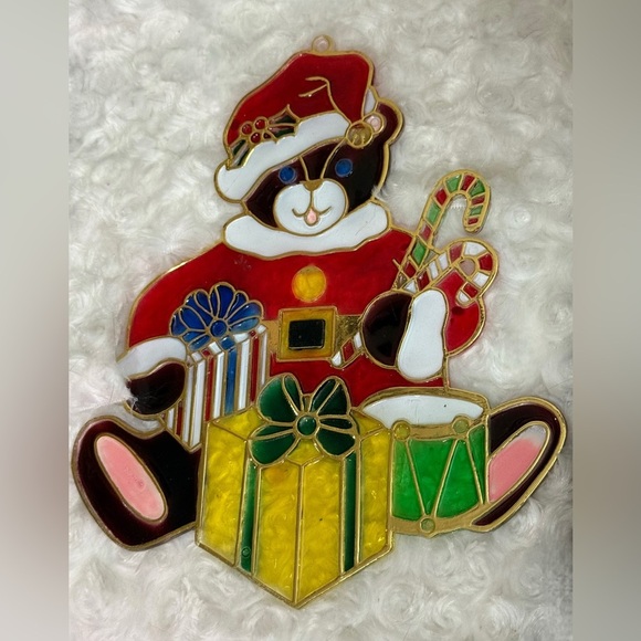 Charming bear ornament in red, green, and yellow. Perfect for window holiday decor. Faux stained glass, plastic decor.