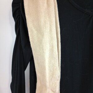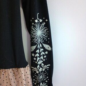 Charming festive dress showcasing a solid black bodice adorned with a delicate heart emblem, paired with a contrasting gold skirt dotted with tiny black specks. The skirt flows gently, offering a subtle flare perfect for twirling. Completing the ensemble is a pair of matching gold tights, creating an elegant, coordinated holiday outfit ideal for seasonal celebrations.