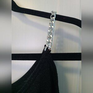 Festive Holiday Party Black Glitter Knit Cold Shoulder Silver Chain Strap Top