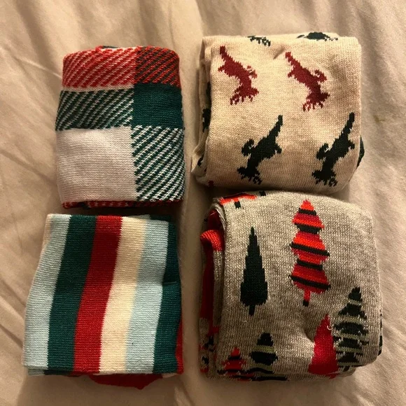 Set of four festive socks. Includes plaid and holiday designs. Perfect for the season.