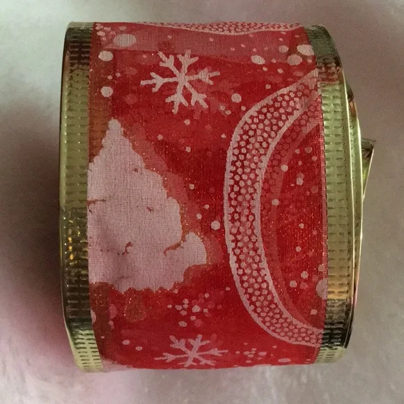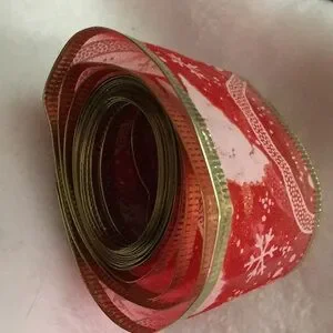Decorative ribbon with red and gold colors. Features snowflake and tree patterns.