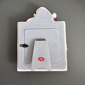 Festive picture frame featuring Santa Claus and a teddy bear in a stocking. Perfect for holiday decor.