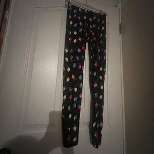 Black leggings with colorful string light pattern. Perfect for festive occasions.