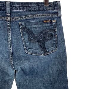 Features: Women's, Japan Rose, Skinny Flare, Ash Dulcet Dark, low rise, flare leg, slight stretch, fading, whiskering, belt loops, 2 back pockets, 2 front pockets, 1 coin pocket, metal rivets, button fly and button closure, medium blue wash, casual, western, cowgirl, work, school, play, workwear, business casual, grunge, punk, streetwear, retro