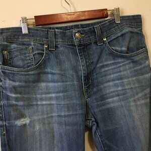 Very good preowned condition, blue Jimmy Helios denim jeans with distressing by Fidelity. Very nicely made in USA. Will hold up over time. There is some slight wear on the crotch seam from chafing, but it does not affect the integrity of the seam really.