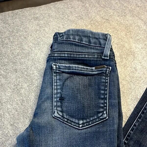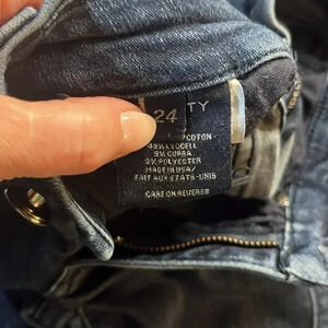 Fidelity Mid Rise Ultra Slim Blue on Blue Wash 24*30. Super stretchy and comfy. There is a small snag in the lower leg as shown in the pics otherwise these are in good condition.