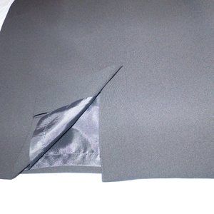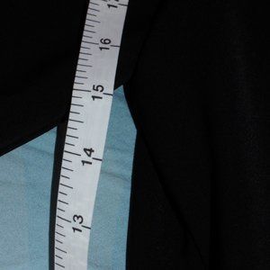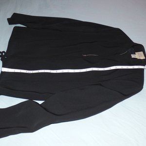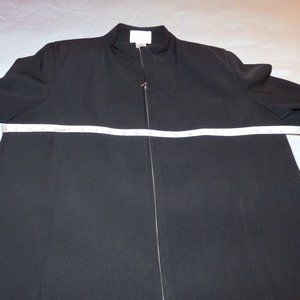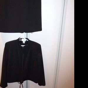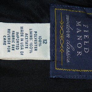 Black Field Manor (Marshall Fields) ladies skirt suit. Jacket is lined with a full length front zipper to mandarin collar, and tie at base. Skirt is lined with a side zipper and rear kick pleat.