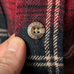A 100% heavy brushed cotton lumberjack shirt by Field & Stream, marked size M in a red, black and white tartan or plaid pattern. Great for men, or oversized for ladies. In good condition, the colour a touch washed and someone wrote and "E" on the neck tag. Loved it, but found it a little too large and stiff for my liking.