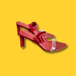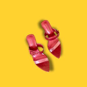 • Clear toe strap, and a thick red strap—with buckle accent