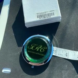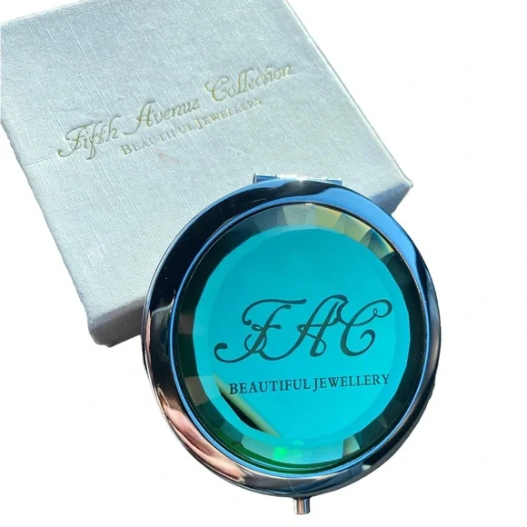 From 2010, the Fifth Avenue Collection emerald green & silver compact mirror. 2 mirrors inside : regular view and close up mirrors. Comes with original box. There is one small scratch on front of compact at bottom(hardly noticeable)