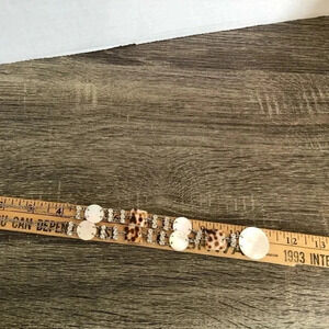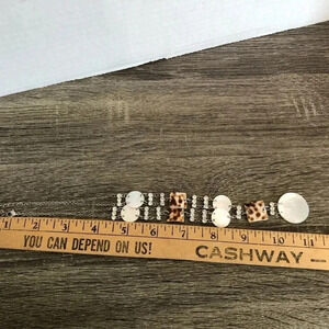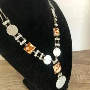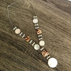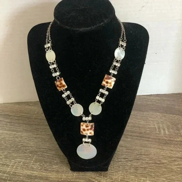 Stunning necklace with rhinestones, Opal/pearl looking shells and brown spotted shells with metal chain.