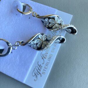 Elongated swirl with clove shape floral crystal motif on black enamel background for an eye-catching appeal, crystal side accents on earrings & necklace, Features Genuine Swarovski Crystals, Sterling Silver earring hooks, rhodium plated silver tone, nickel & lead free, hypoallergenic. Comes in Fifth Avenue Collections box and gift with purchase travel packable tote bag pictured.