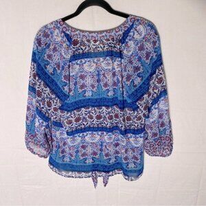 Fig And Flower Blue Red White Multi Print Boho tTie Front Semi Sheer Blouse M