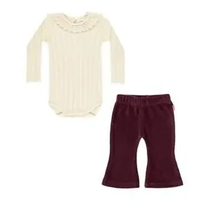 An adorable outfit featuring a ruffled collar bodysuit made of pointelle fabric and flared legging-style pants (elastic waistband) in fig velvet. So cute!