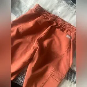 Rust-colored scrub pants with elastic waistband.