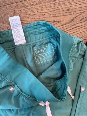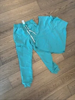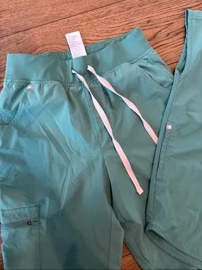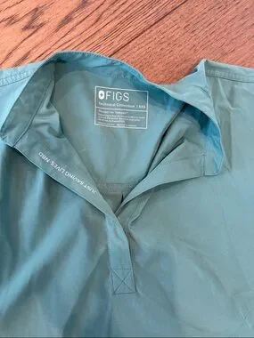 Lightweight Figs scrub top in teal. Top is XXS but fits up to a medium. Soft, breathable fabric for long shifts. Simple, professional style. Pants are a small tall length. This is the free-x that is lined and light weight.