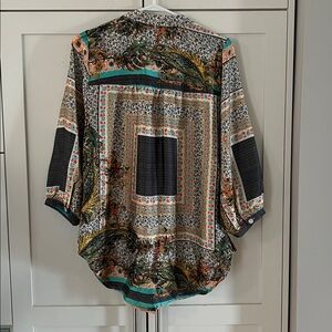 Vibrant blouse with a mix of patterns and colors. Features a button-up front and 3/4 sleeves.