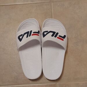 Comfortable Fila slide sandals. Available in black and white. Bold logo design on strap.