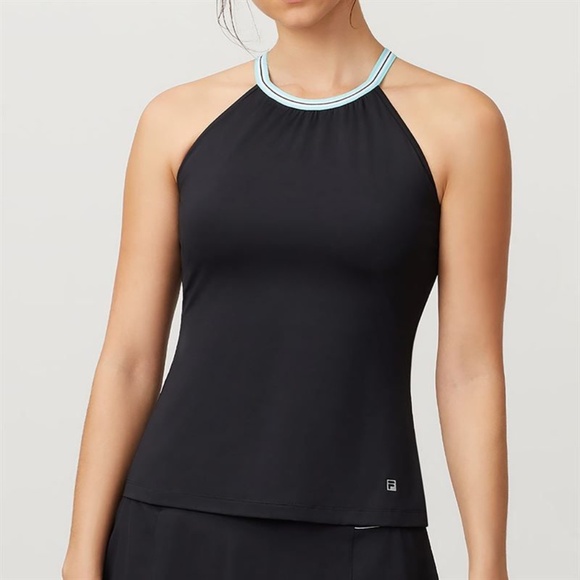Chic Fila halter tank top in black with white trim. Ideal for casual outings.