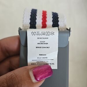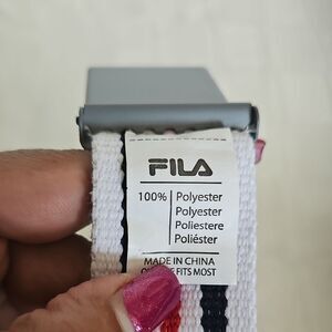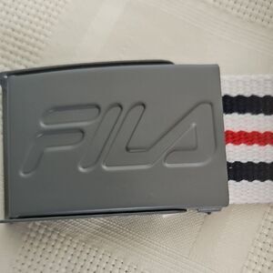 Classic Fila belt in white. Features navy and red stripes. Durable buckle design.