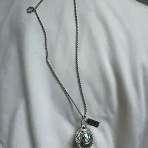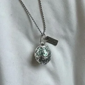 Elegant silver filigree locket necklace featuring a mint green orb. Stylish pendant with intricate scrollwork for a refined look. Lightweight and versatile for everyday wear. Includes a silver-tone ball chain for easy styling.