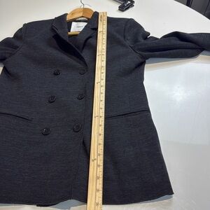 This is a Filippa K blazer in grey. It is in good preowned condition and is a size small. The measurements are in the pictures for reference ` Approx. Pit to pit 17" length 26". It is lined and has raw edges. The fabric is a cotton/nylon blend with a cotton lining.