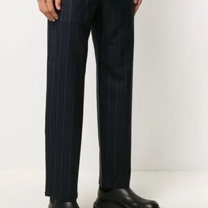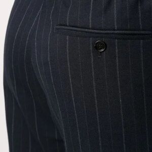 Navy blue wool blend Theodore striped trousers from Filippa K featuring an elasticated waistband with a drawstring fastening, side pockets, a rear pocket and a striped pattern