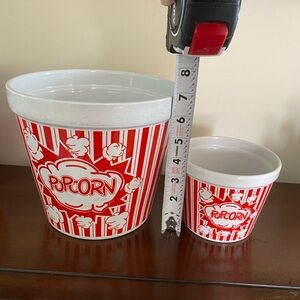 Stylish container with red and white design. Ideal for serving snacks. 4 individual serving bowls and one large bowl