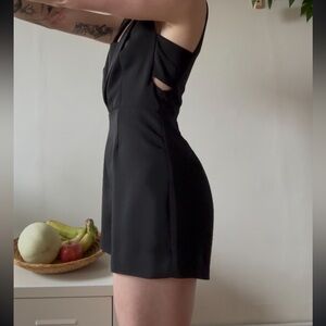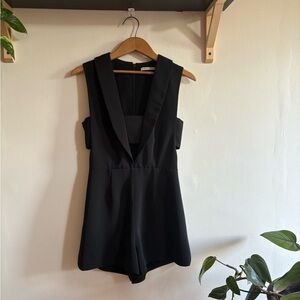 Chic and structured black playsuit by Australian brand Finders Keepers, featuring a tailored fit with deep V lapel neckline and subtle side cut-outs. Perfect for a night out or a stylish event, this romper blends a blazer-inspired silhouette with playful modern edge.
