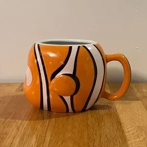 Charming ceramic Disney mug with a playful fish design. Bright orange with black and white accents. Ideal for Disney fans.