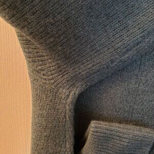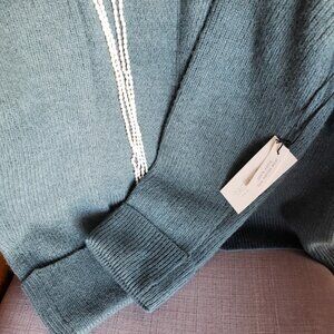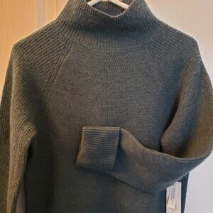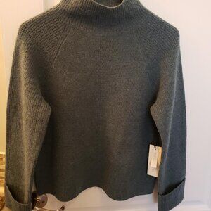 This beautiful green/grey fine merino wool has a lovely mock turltleneck and rolled sleeves. Can be rolled down for added length and comfort. It is a gorgeous grey that can be worn casually or dressed up with pearls or a scarf to show that more glamorous side of you. Made by Rachel Zoe who designs glamorous clothing for women, it a sweater that not only will keep you cozy and warm but can also keep you cool. Merino wool is the finest wool and is not itchy like the types of wool that once were sold. The beauty is even machine wash in cold water or hand wash cold, can be hung to dry or it states you can machine dry on cool. The size is a standard M.