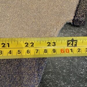 Round neck, top with light and dark top, gray, charcoal stripes with metallic threading throughout for that shimmer. Fine knit. Thin ribbed, trim at waist, neckline, and sleeves excellent condition. Measurements in pics: pit to pit and midway as it tapers in.