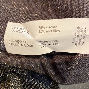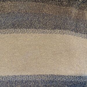 Round neck, top with light and dark top, gray, charcoal stripes with metallic threading throughout for that shimmer. Fine knit. Thin ribbed, trim at waist, neckline, and sleeves excellent condition. Measurements in pics: pit to pit and midway as it tapers in.