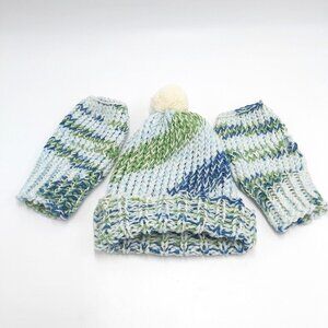 Fingerless Gloves Beanie Hat Toque Pompom Small Blue Green Handmade Loom Knit