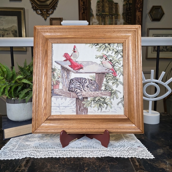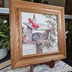 Finished Cross Stitch Cat Cardinal Art 14" Frame Needle Treasures Caught Napping