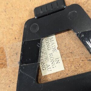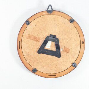 A sweet little cross stitched doggy portrait of a white Bison Frisé of Maltese. Framed in a brown circular plastic frame with hanging loop and strut (taped to the back. The frame was made in Hong Kong.