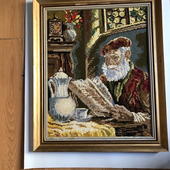 Finished needlepoint needlework embroidery picture old man reading wood framed