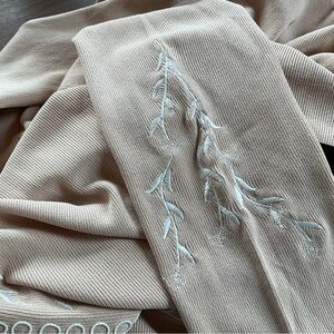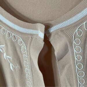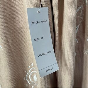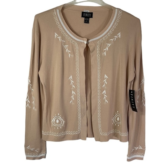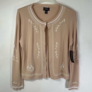 Finity NWT new cardigan lightweight embroidered sweater. Tan with cream white embroidered details. Medium