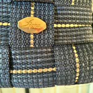 This Fiona purse is beautiful. It is a woven straw purse that was made in Italy. The purse dimensions are: Length- 12” Width- 4” Height- 11”. This purse has a gold coloured hardware. The handle is coiled gold metal enclosed in a clear plastic tube. There is also a detachable braided fabric shoulder strap that is 13” long. This purse has a buckle closure on the front. The interior is fully lined. There is a thin pocket on the inside that has a zipper. This bag is unique and the gold metallic woven through the straw coupled with the gold hardware adds a luxe detail. This purse is in excellent condition.