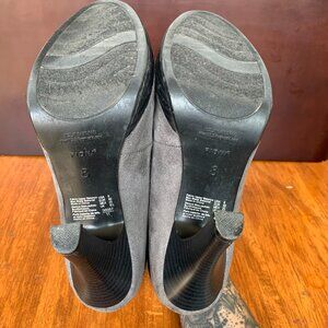Fioni grey ankle booties in faux suede with black heels. Some stiffness due to storage.