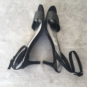 Black. Open toe pumps. Approximately 2.5 inch heel. Ankle strap with buckle. Single wide glitter toe strap.